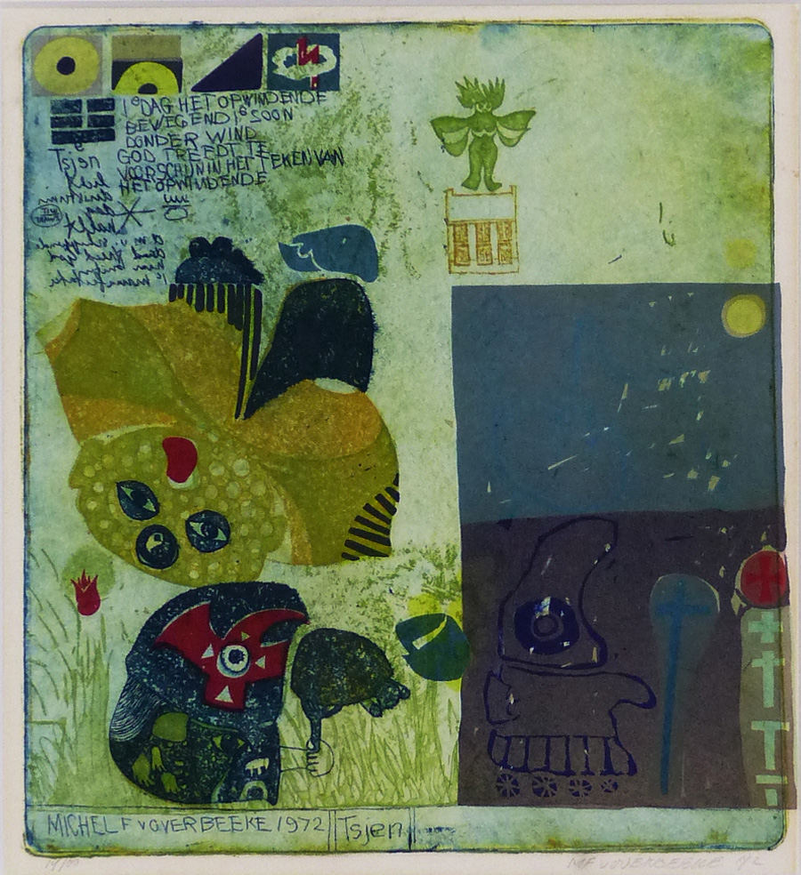 In 1972 bracht Michel van Overbeeke een houten cassette met negen etsen met aquatint en litho uit: ‘I Tjing’. In de eikenhouten cassette zat een glasplaat zodat je regelmatig een andere ets achter het glas kon plaatsen: een wisselende tentoonstelling, dus.
