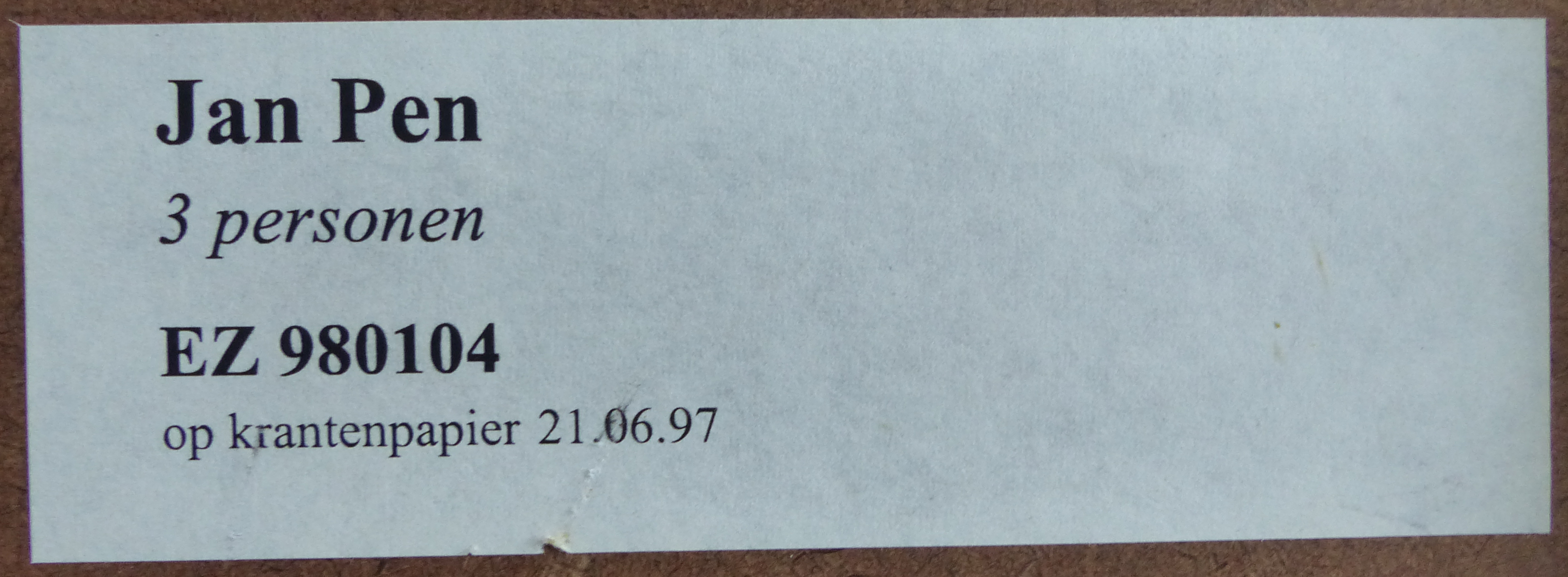 Een van de bekendste economen van ons land, Jan Pen, werd geboren 15 februari 1921 in het Friese Lemmer. Na zijn studie economie in Amsterdam was hij een tijd werkzaam op het ministerie van Economische Zaken als, zoals hij zelf omschreef, “ambtelijk populisator van de wetenschap’’. Na zijn promotie in 1950 werd hij in 1956 hoogleraar in de staathuishoudkunde en de leer der openbare financiën aan de Rijksuniversiteit Groningen (hij figureerde in W.F. Hermans’ beroemde roman ‘’Onder professoren’’ als Tabe Pap). Zijn doel was de economie inzichtelijk te maken voor een breed publiek en aanzetten tot kritisch nadenken. Daartoe heeft hij een geweldig aantal publicaties op zijn naam staan, die de 20.000 bladzijden overschrijden. Jan Pen woonde in Haren bij Groningen. Zijn garage was verbouwd tot studeerkamer en atelier. Er lagen grote stapels beschilderde kranten. De kranten werden bewerkt met latex muurverf en daarna beschilderd met Talens Decorfin en betekend met krijt. Verkopen deed hij zijn schilderijen nooit. Hij gaf ze weg. In het vragenformulier voor het Lexicon Nederlandse Beeldende Kunstenaars (1970) vermeldt hij dat hij aanvankelijk ‘’stillevens en figuren à  la Picasso schilderde’’. Zijn werk werd daarna abstract: ‘’verlate epigoon van Cobra, gebruikt nogal wat modder, zand, etc”. Een dag voor zijn 89e verjaardag overleed Jan Pen op 14 februari 2010 in Haren.