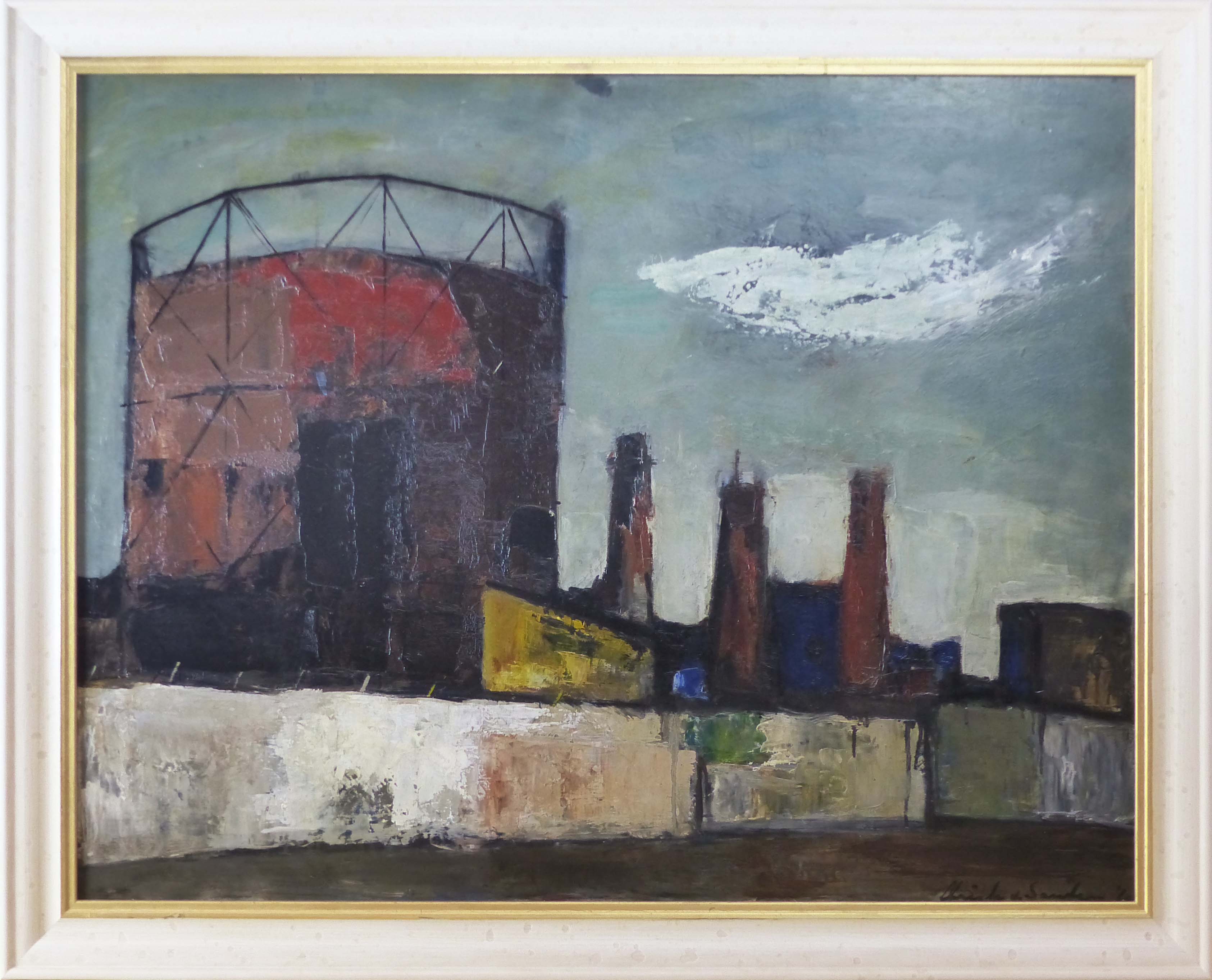 Een vroeg werk van Christa van Santen uit de periode dat zij nog veel schilderde. Zij maakte in die periode meerdere schilderijen met industrie als thema. In de collectie van het Kunstmuseum Den Haag bevindt zich een gelijksoortig werk ''Stadwijk met fabriek" (zie laatste foto). Het zijn schilderijen zonder mensen en natuur maar zeer tonig met hoekige vormen. Het schilderij uit mijn collectie onderscheidt zich van het museumwerk door het intrigerende wolkje rechts in de verder grijzige lucht en de fraaie, gedempte maar warme kleuren. De locatie heb ik niet precies kunnen achterhalen maar ik vermoed dat het schilderij is geïnspireerd op de Haagse gasfabriek.